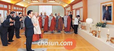 이명박 대통령이 12일 길상사의 법정 스님 영정 앞에서 조문하고 있다./최순호 기자
