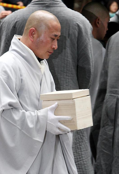 법정 스님의 법구가 14일 오전 전남 순천 송광사 조계산 언덕에 마련된 다비장에서 다비돼 유골함에 옮겨졌다. /연합뉴스