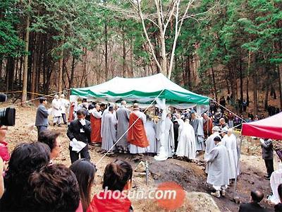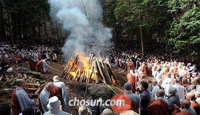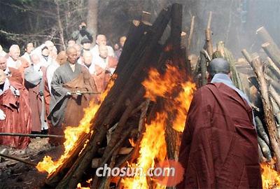 14일 오전 전남 순천시 송광사 경내 다비장에서 법정 스님의 유골을 수습하는 습골의식이 진행되고 있다. /조선일보