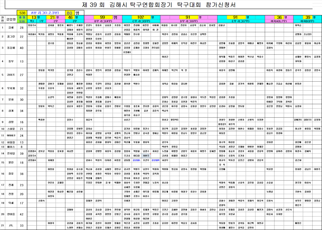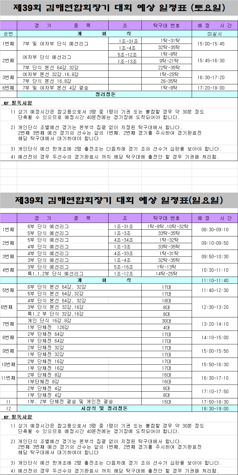 L_____ 대진표 (최종 수정분) 작성자아침햇쌀™|작성시간14.07.03|조회수32 목록 댓글 0 글자크기 작게가 글자크기 크게가 제39회 김해시탁구협회장기탁구대회 개인전 단체전 대진표.xlsx 첨부파일첨부된 파일이 3개 있습니다. jpg 파일 제39회김해시일정표.jpg 다운로드 jpg 파일 제39회김해시전체참가자명단.jpg 다운로드 xlsx 파일 제39회 김해시탁구협회장기탁구대회 개인전 단체전 대진표.xlsx 다운로드 다음검색 현재 게시글 추가 기능 열기 북마크 신고 센터로 신고 댓글 댓글 0 댓글쓰기 답글쓰기 댓글 리스트