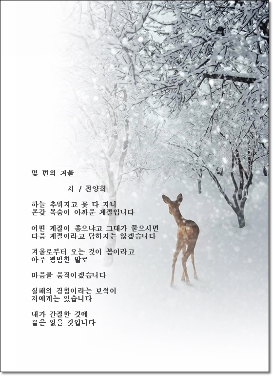 몇 번의 겨울 / 천양희 작성자허돌|작성시간23.01.05|조회수20 목록 댓글 0 글자크기 작게가 글자크기 크게가 이미지 / 인터넷에서 다음검색 현재 게시글 추가 기능 열기 북마크 공유하기 신고 센터로 신고 댓글 댓글 0 댓글쓰기 답글쓰기 댓글 리스트 맨위로 카페 검색 취소 카페 검색어 입력폼 검색 검색어 지우기 답글 제목댓글(0)