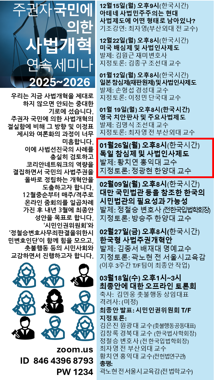 독일의 참심제와 사법인사제도를 발제할 황치연 교수는 헌법연구관으로 오랫동안 재직하면서 독일 헌법재판소에 파견되어 연구 활동을 하기도 하였습니다. 한국의 현실과 대비하여 사법개혁의 중요한 요소를 제시할 것입니다. 지정토론은 정광현 한양대 교수가 맡습니다.