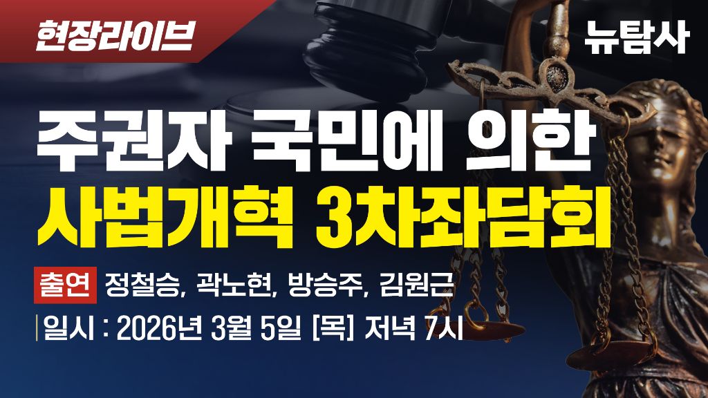 뉴탐사(NewTamsa)에서 진행한 '주권자 국민에 의한 사법개혁 3차 좌담회' 영상 내용을 상세하게 정리해 드립니다. 이 영상에는 정철승 변호사(사회), 곽노현 전 교육감, 방승주 한양대 로스쿨 교수, 그리고 미국 현지의 김원근 변호사가 패널로 참여했습니다.