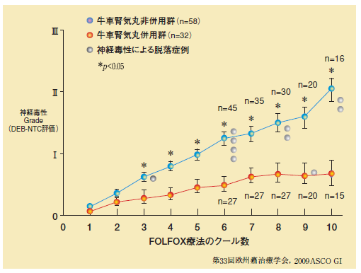 축적량은 牛車腎気丸투여군 쪽이 조금 많은 정도임에도 신경 독성 Grade는 낮습니다. 이는 대단한 낭보라고 생각합니다. 河野 선생님은 牛車腎気丸의 유효성에 대해서 2009 ASCO GI*2에서 발표하셨는데 저 역시 회장에서 발표가 대단히 주목받는 것을 삼가 보았습니다. 河野 선생님은 인쇄물(Handout)을 200부 정도 작성하셨는데, 대부분 없어졌더군요. 현재 저희들도 ASCO에 演題를 제출해놓고 있습니다.
