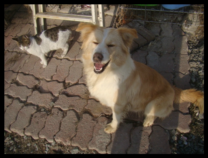 뒤에 있는 고양이 알록이랑 사이가 참 좋아요, 장미가 알록이 밥을 노리만 알록이는 별로 개의치않아요