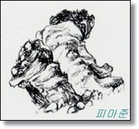 ▶지마(芝麻)준 호마준이라고도 하는데 피마준이나 난마준을 아주 짧게 그린 모양으로 참깨 같다하여 붙여진 이름이다. 지마(芝麻)준은 피마(披麻)준과 난마(亂麻)준의 선(線)을 짧게 나누어 긋는 것으로 붓 끝을 슬슬 문지르는 기분으로 그리는 준이다. 즉 점(點)에 이르기 전에 짧은 감선(監膳)으로 나타내는 것으로 보면 된다. 특히 먼 산을 그릴 때 사용되며 송(宋)나라 화가들이 애용하였다.