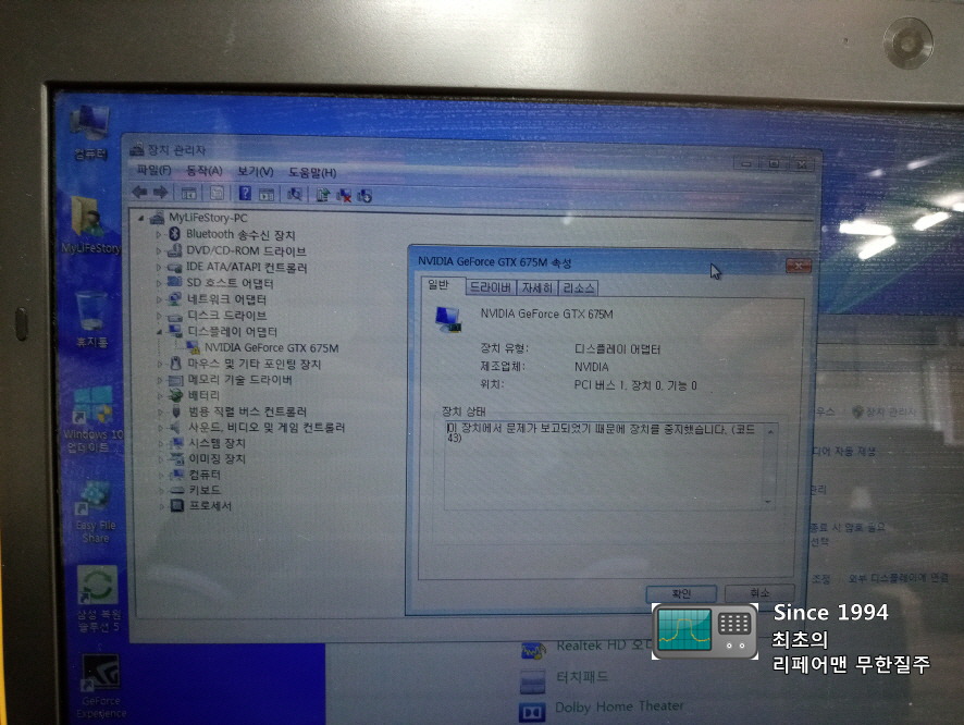 NVIDIA Geforce GTX 675M 장치 관리자에서 인식 오류가 발생했습니다.