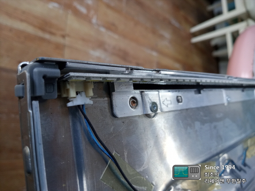 백라이트 바 나사로 고정해야 하는데 몇 개를 잠그지 않아서 들떠 있습니다.