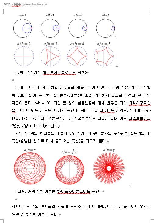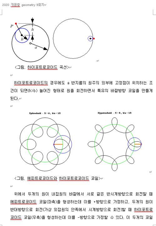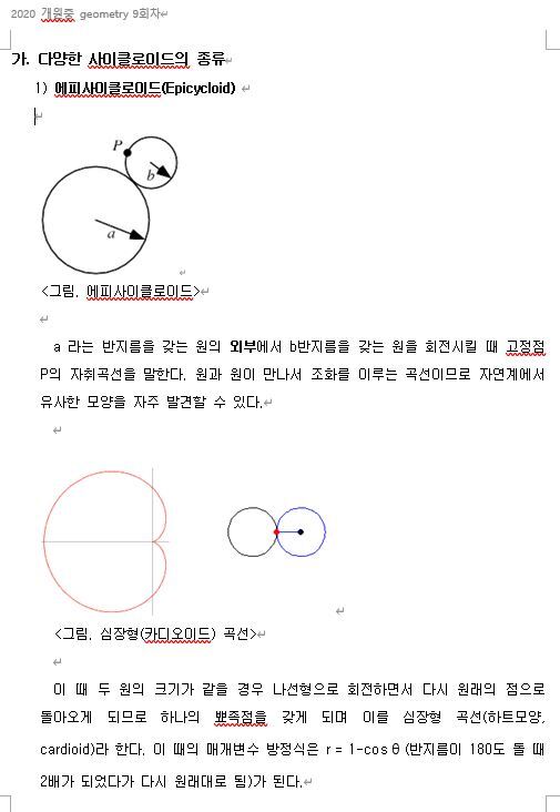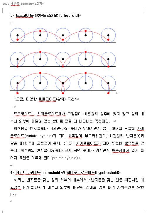 조금 자세히 오늘 한 것을 이야기하자면, 에피사이클로이드, 하이포사이클로이드, 트로코이드, 에피트로코이드, 하이포트로코이드에 대해서 알아보고, 사이클로이드의 정의와 기원에 대해서 탐구해 보는 시간을 가졌다.