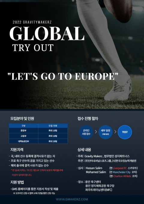 유럽축구 트라이아웃을 실시합니다. 전국에 있는 중,고, 대학 및 성인 팀 축구 선수는 많은 지원 바랍니다.
