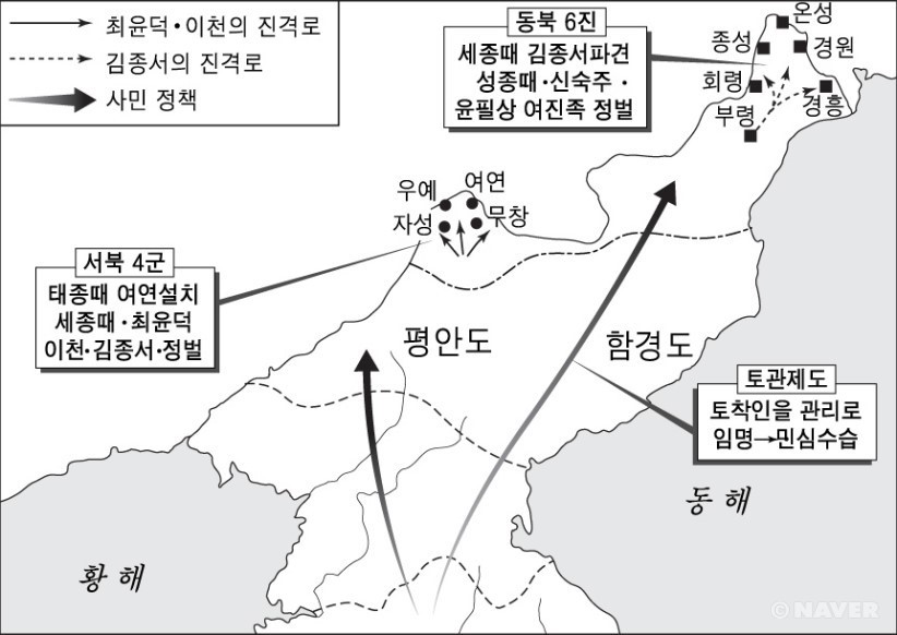 세종은 이 지역에 백성들이 없으므로 남방의 백성들을 이주시키는 사민 정책을 실시하였고, 그 지방의 사람을 그 지방의 관리로 임명하는 토관 제도(고려의 사심관 제도와 동일)를 실시하였다.