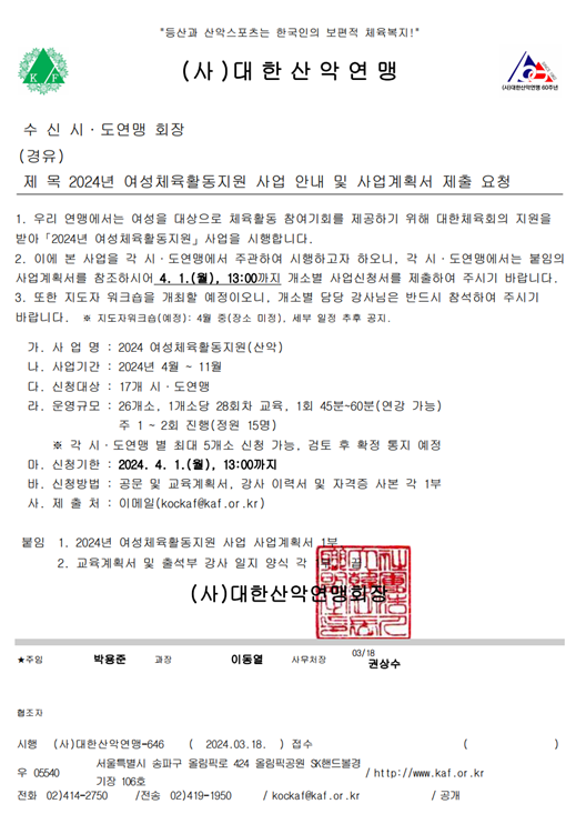 [대한산악연맹] 2024년 여성체육활동지원 사업 안내 및 사업계획서 제출 요청 작성자사무국|작성시간24.03.22|조회수10 목록 댓글 0 글자크기 작게가 글자크기 크게가 2024년 여성체육활동지원 사업 안내 및 사업계획서 제출 요청.pdf105.17KB붙임1_2024 여성체육활동지원사업 사업계획서.hwp61.50KB붙임2_교육계획서 및 출석부 강사일지 양식.hwp38.00KB 첨부파일첨부된 파일이 4개 있습니다. etc 파일 urlUploadImage 다운로드 hwp 파일 붙임2_교육계획서 및 출석부 강사일지 양식.hwp 다운로드 hwp 파일 붙임1_2024 여성체육활동지원사업 사업계획서.hwp 다운로드 pdf 파일 2024년 여성체육활동지원 사업 안내 및 사업계획서 제출 요청.pdf 다운로드 다음검색 현재 게시글 추가 기능 열기 북마크 신고 센터로 신고 댓글 댓글 0 댓글쓰기 답글쓰기 댓글 리스트
