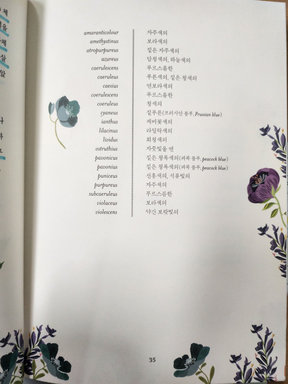 Purpurea 푸푸레아는 보라색이고, lilacina 릴라치나는 연보라색, violaceus 비올라체우스는 자주색, azureus 아주레우스는 하늘색이다.