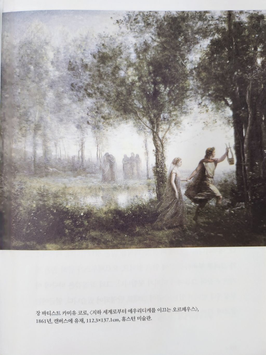 다만 여기에는 조건이 있었습니다. 지상으로 나가기 전까지 오르페우스가 그의 뒤를 따르는 에우리디케를 돌아봐서는 안 된다는 것이었어요. 프랑스 화가 장 바티스트 카미유 코로의 <지하 세계로부터 에우리디케를 이끄는 오르페우스>는 그 장면을 그리고 있습니다. 아내를 데리고 이승으로 돌아갈 수 있다는 사실에 신이 난 오르페우스가 수금을 흔들며 앞장서 걸어갑니다. 그리고 에우리디케는 남편 손을 잡고 설레는 마음으로 그 뒤를 따릅니다. 아련하고 아득한 분위기로 충만한 풍경은 이곳이 아직 지하 세계임을 선명히 드러내 보입니다.