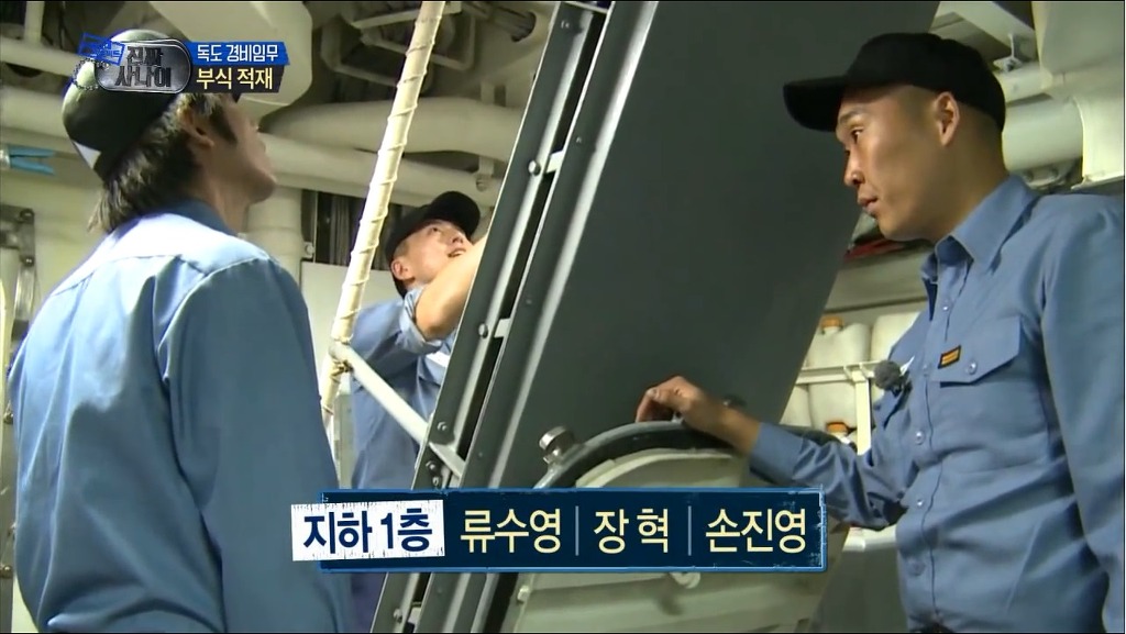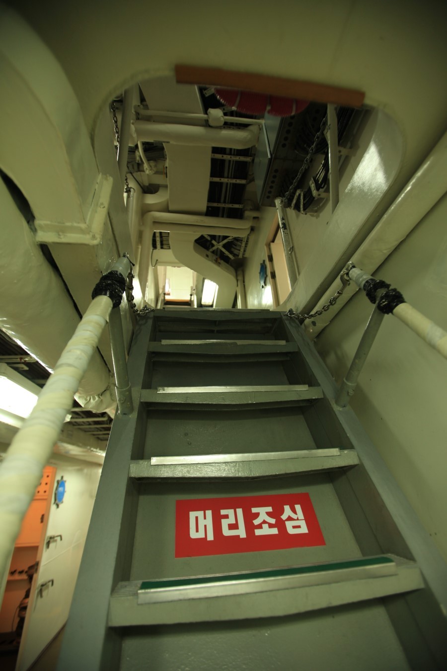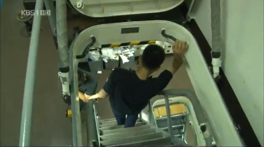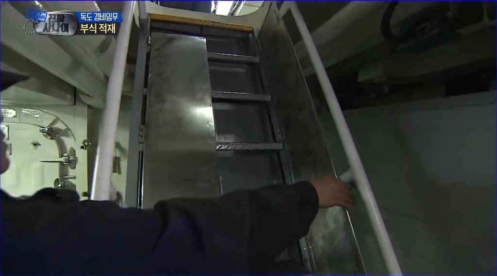 (아래) 부식을 나를 때 계단 양쪽으로 덧대어진 철판을 접으면 화물운반용 미끄럼틀로 변신한다. / 광개토대왕함 하부1층 계단.