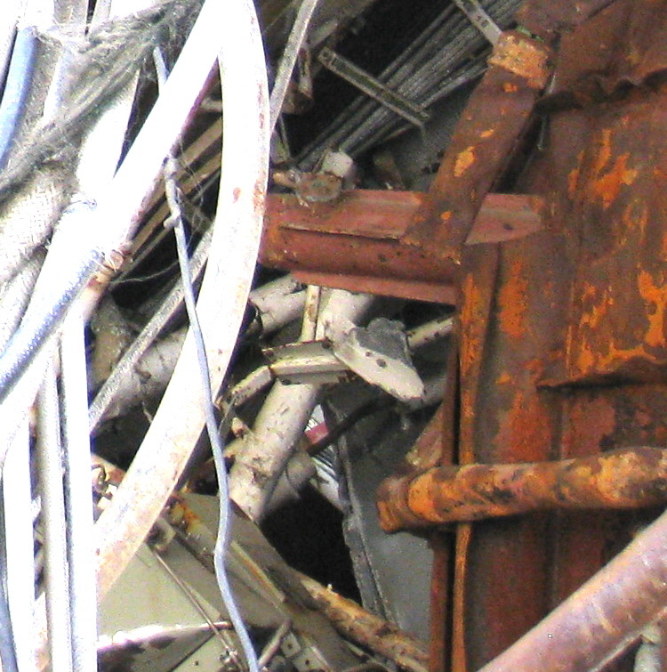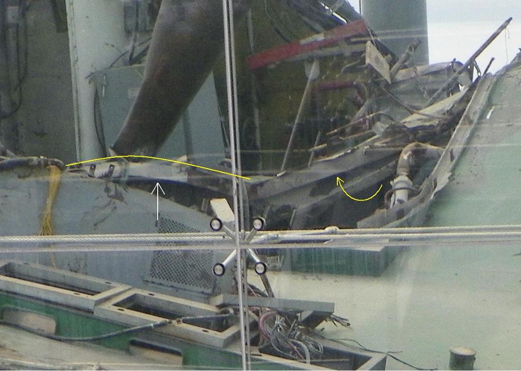 (아래) 한편, 연돌 연결구(맨홀) 테두리 뒤쪽은 아래로 부터 충격(흰 화살표 표시)에 의해 위로 휘어졌으며 테두리 좌측 H빔은 좌측으로 부터 충격에 의해 우측으로 휘어진 모습이다.