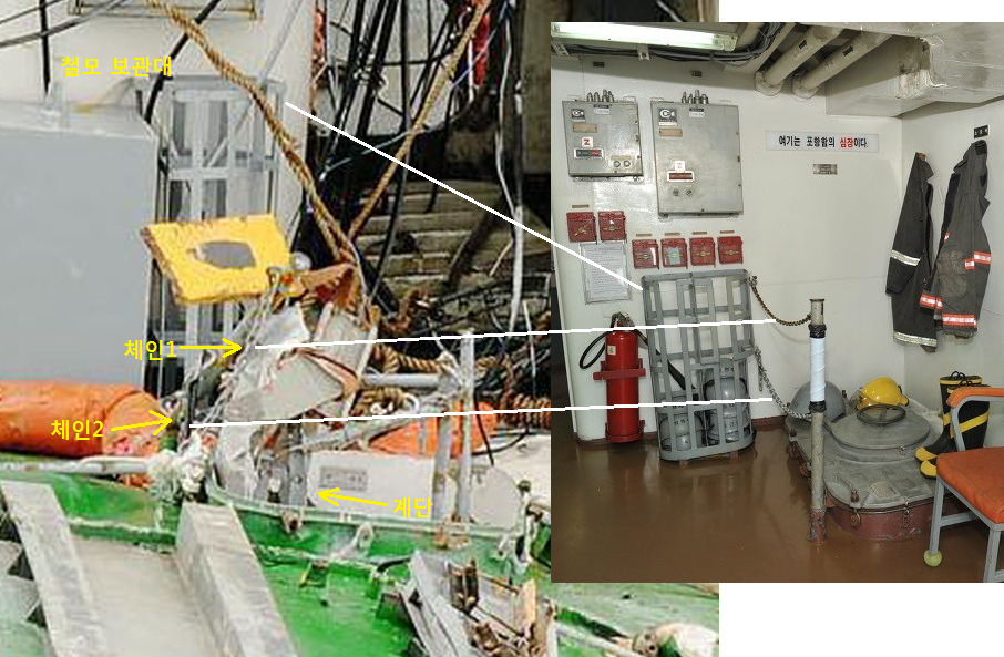 (아래) 포항함 철제 계단 손잡이 상단에 달린 체인이 천안함 가스터빈실 계단 손잡이 체인과 동일하다. / 포항함 함수 상부 1층에서 상부 2층으로 오르는 계단으로 보임.