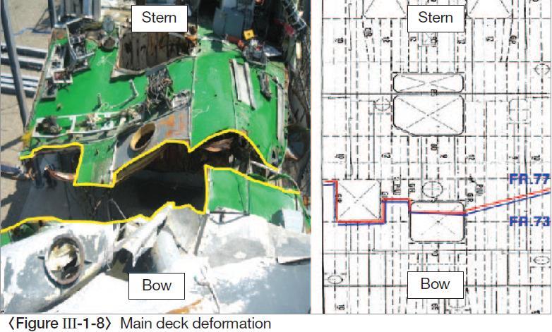 이것은 함미 주갑판 우현쪽 맨홀 테두리에 이어 절단면 중에서 상부로 구부러진 두번째 철제인데 주갑판이 두쪽으로 갈라진후