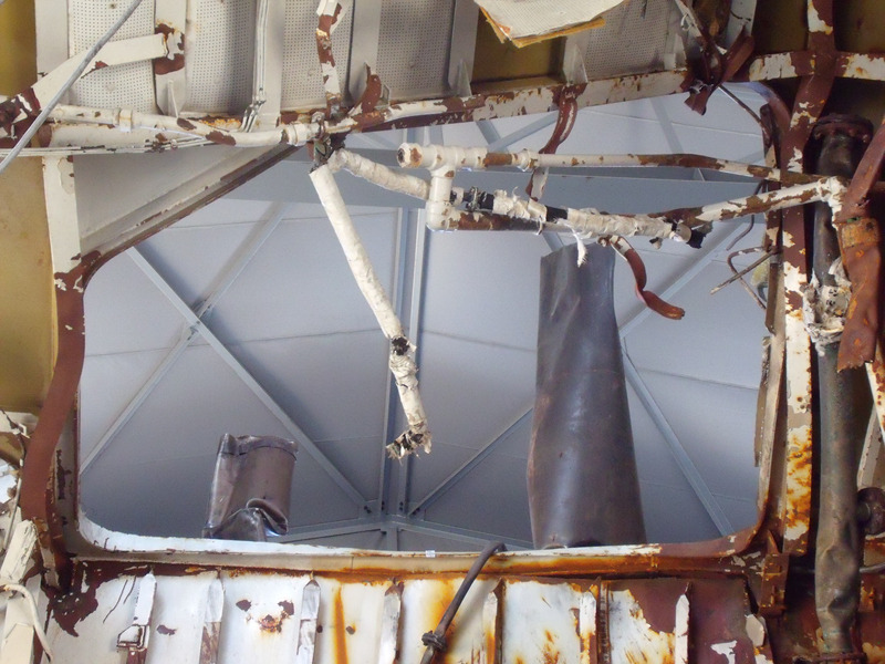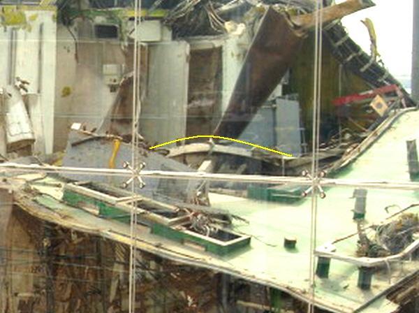(아래) 그러나 터빈실 천정에 뚤린 맨홀 뒤 테두리는 위로 구부러진 흔적이 보이지 않는다.