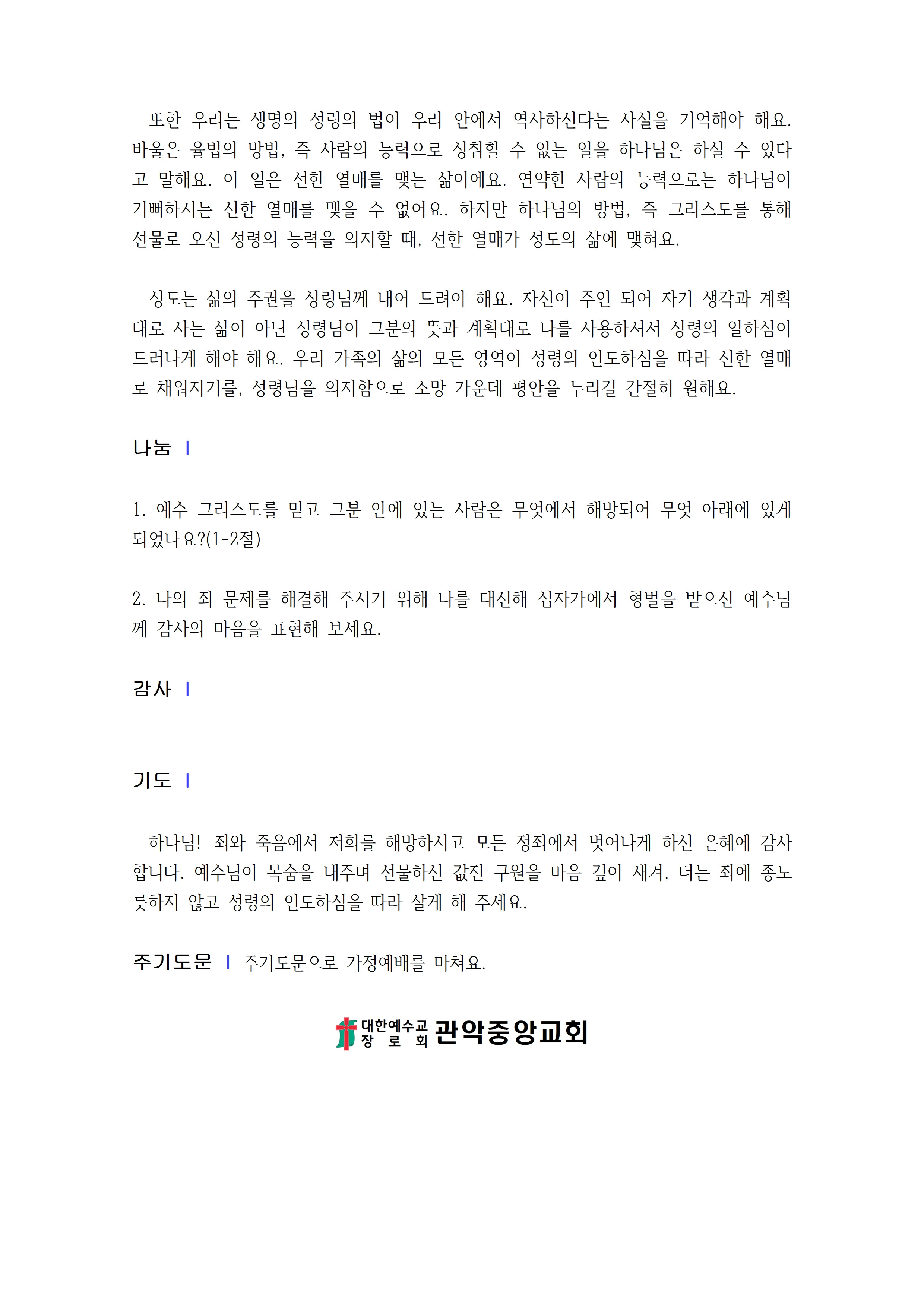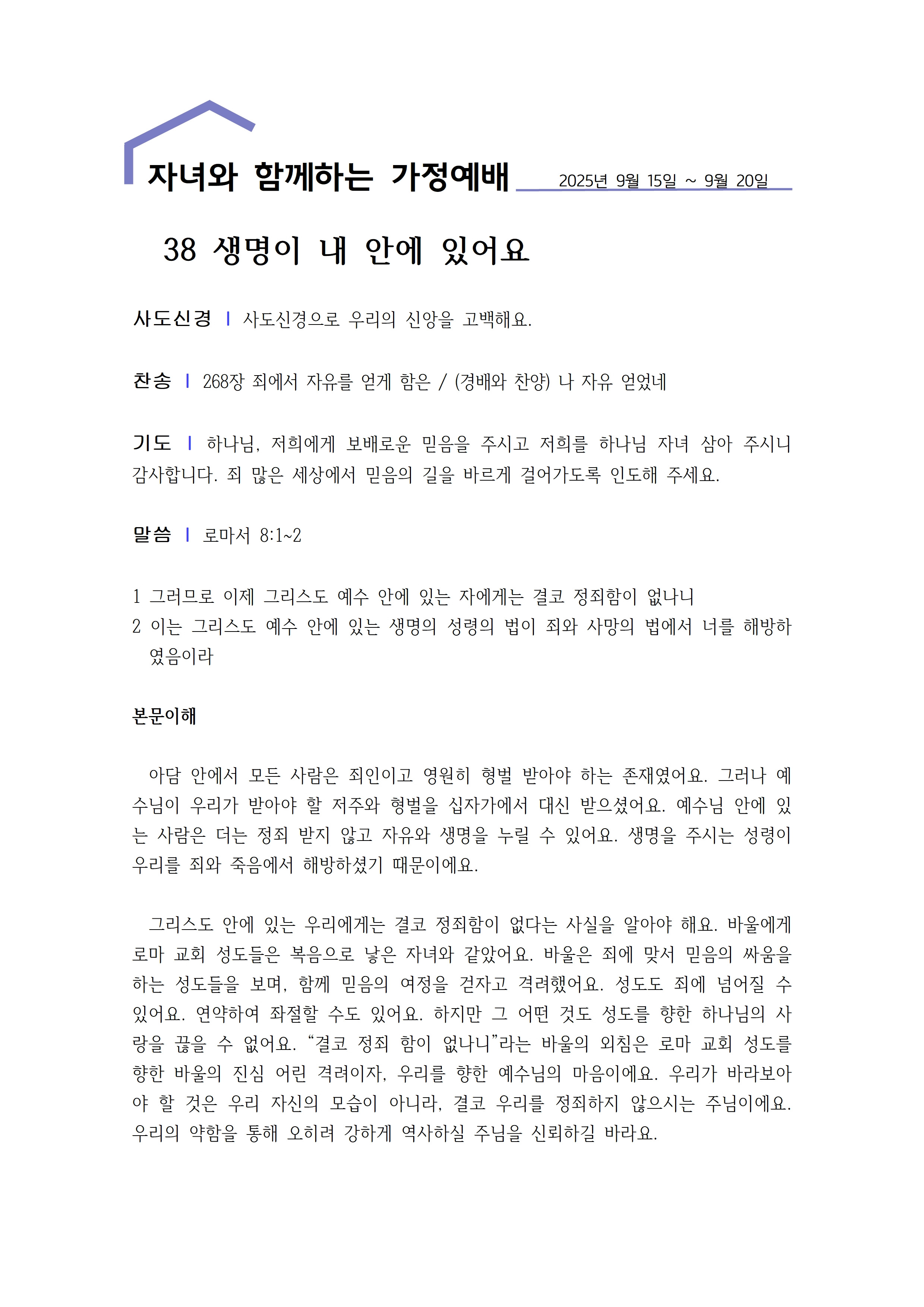 2025년 38주차 가정예배 순서지 작성자관악중앙교회|작성시간25.09.12|조회수37 목록 댓글 0 글자크기 작게가 글자크기 크게가 다음검색 현재 게시글 추가 기능 열기 북마크 공유하기 신고 센터로 신고 댓글 댓글 0 댓글쓰기 답글쓰기 댓글 리스트