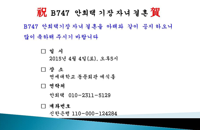자녀결혼> B747 안희택 기장 (항대 18회) 자녀 결혼 공지 작성자총무 40회 이욱재|작성시간15.03.26|조회수256 목록 댓글 2 글자크기 작게가 글자크기 크게가 다음검색 현재 게시글 추가 기능 열기 북마크 공유하기 신고 센터로 신고 댓글 댓글 2 댓글쓰기 답글쓰기 댓글 리스트 작성자성영탁 | 작성시간 15.03.27 자손만대. 번영을 이루실 전기를 만드신거에 대하여 감축드리오며 추카드림니다.........행복하시겠슴니다 답댓글 작성자안희택 | 작성시간 15.03.31 고맙습니다... 댓글 전체보기