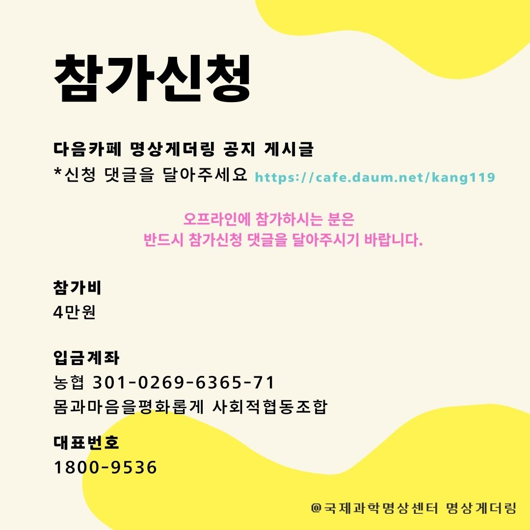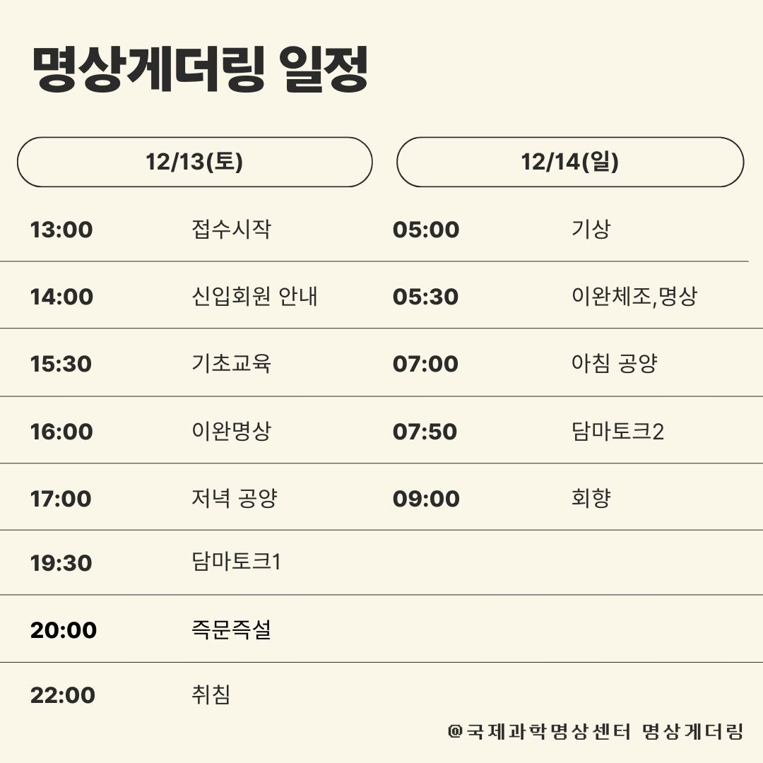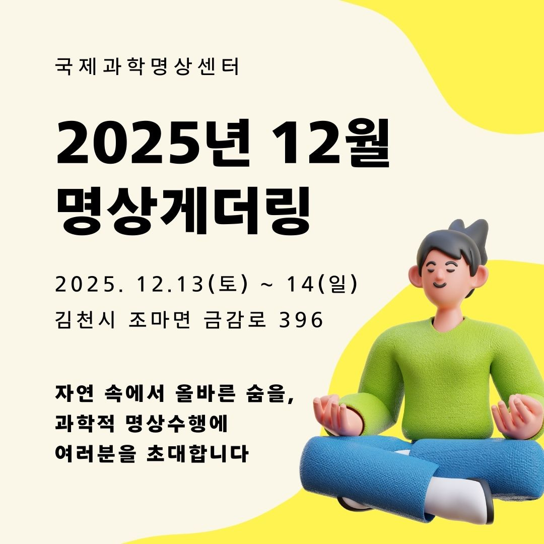 2025년 12월 정기 명상게더링 안내 작성자국제과학명상센터|작성시간25.11.28|조회수359 목록 댓글 9 글자크기 작게가 글자크기 크게가 다음검색 현재 게시글 추가 기능 열기 북마크 공유하기 신고 센터로 신고 댓글 댓글 9 댓글쓰기 답글쓰기 댓글 리스트 작성자청산은 | 작성시간 25.12.10 참석합니다. 작성자혜문 (慧文) | 작성시간 25.12.12 참석합니다 작성자혜명(慧命/善來) | 작성시간 25.12.12 참석합니다 ((())) 작성자혜조(엔사루스) | 작성시간 25.12.12 참석합니다._((()))_ 작성자혜의(하늬) | 작성시간 25.12.12 참석합니다 댓글 전체보기