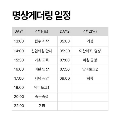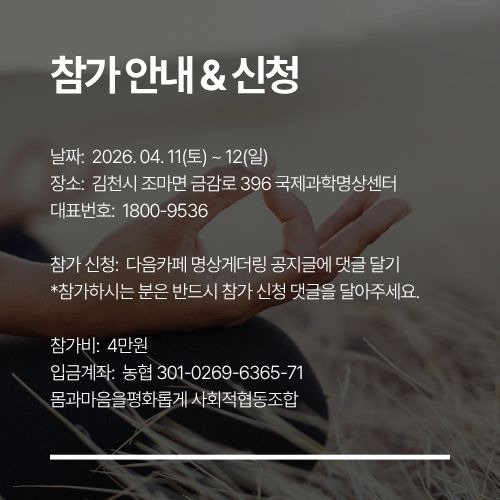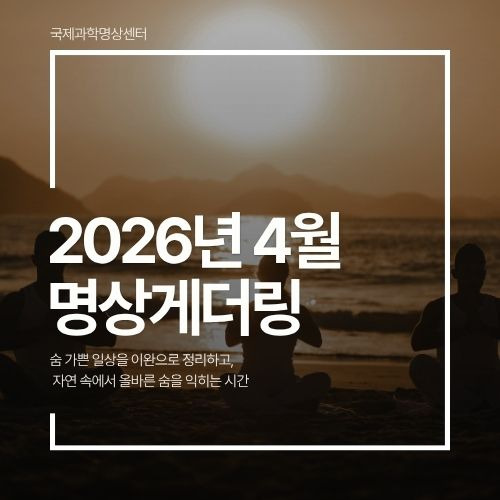 2026년 4월 정기 명상게더링 안내 작성자국제과학명상센터|작성시간26.03.29|조회수388 목록 댓글 10 글자크기 작게가 글자크기 크게가 다음검색 현재 게시글 추가 기능 열기 북마크 공유하기 신고 센터로 신고 댓글 댓글 10 댓글쓰기 답글쓰기 댓글 리스트 작성자은성 | 작성시간 26.04.06 참석합니다. 작성자봉인 | 작성시간 26.04.07 참석합니다. 작성자혜문 (慧文) | 작성시간 26.04.10 참석합니다 작성자묘희 | 작성시간 26.04.10 참석합니다 작성자혜우 | 작성시간 26.04.11 윤여완님 참석합니다 댓글 전체보기