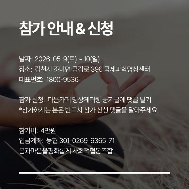 2026년 5월 정기 명상게더링 안내 작성자국제과학명상센터|작성시간26.04.25|조회수81 목록 댓글 4 글자크기 작게가 글자크기 크게가 다음검색 현재 게시글 추가 기능 열기 북마크 공유하기 신고 센터로 신고 댓글 댓글 4 댓글쓰기 답글쓰기 댓글 리스트 작성자혜구 (우담) | 작성시간 26.04.26 참석합니다 작성자Yangheedeuk | 작성시간 26.04.26 반갑습니다.참석합니다. 작성자혜동(환동) | 작성시간 26.04.27 참석합니다 작성자무한불성 | 작성시간 26.04.27 참석합니다 댓글 전체보기