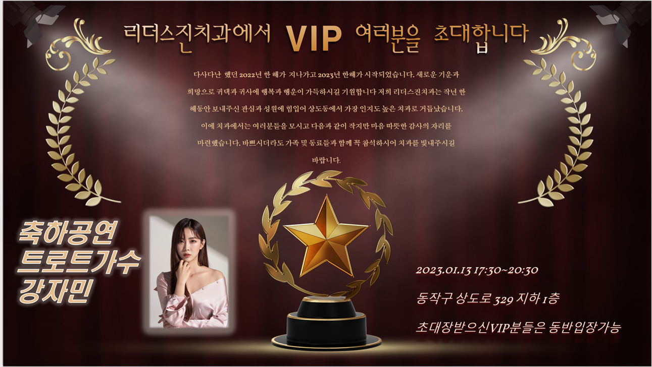 2023년 1월13일 리더스진치과신년회 작성자Kimdaeeun|작성시간23.01.07|조회수62 목록 댓글 1 글자크기 작게가 글자크기 크게가 리더스진치과 VIP초청 신년회 축하무대오후 7시 가수 강자민 다음검색 현재 게시글 추가 기능 열기 북마크 공유하기 신고 센터로 신고 댓글 댓글 1 댓글쓰기 답글쓰기 댓글 리스트 작성자고구려발해 | 작성시간 23.01.08 감사합니다. ^-^~~~ 댓글 전체보기