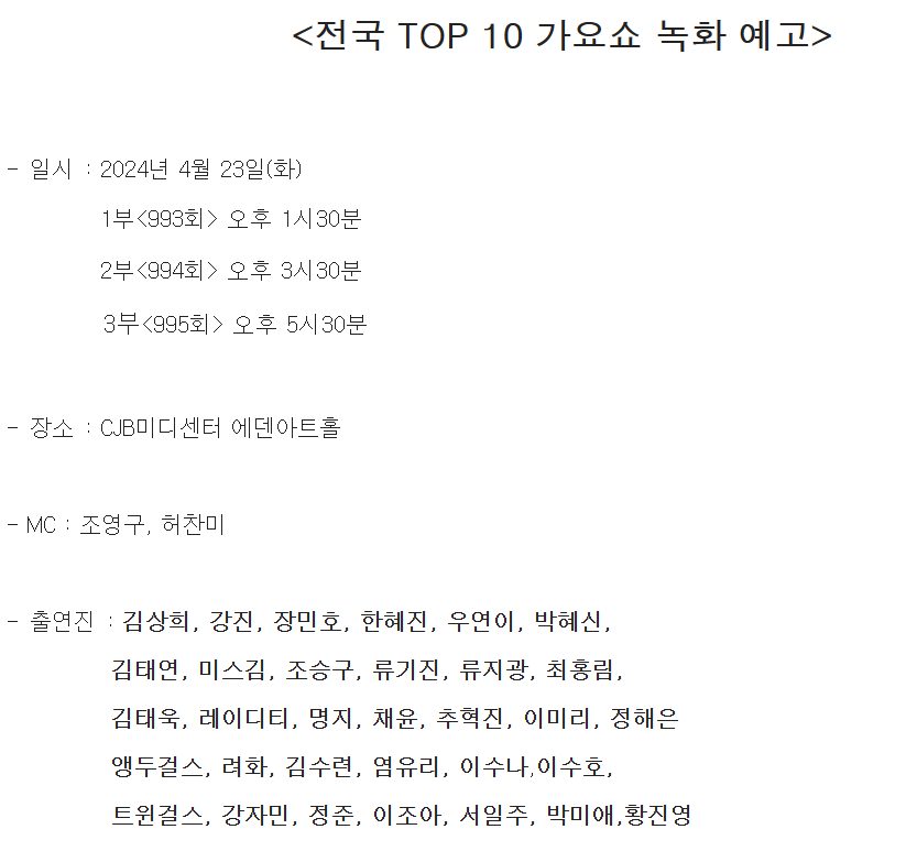 청주 CJB 전국TOP10가요쇼 녹화 작성자초코몽|작성시간24.04.13|조회수54 목록 댓글 0 글자크기 작게가 글자크기 크게가 다음검색 현재 게시글 추가 기능 열기 북마크 공유하기 신고 센터로 신고 댓글 댓글 0 댓글쓰기 댓글 리스트