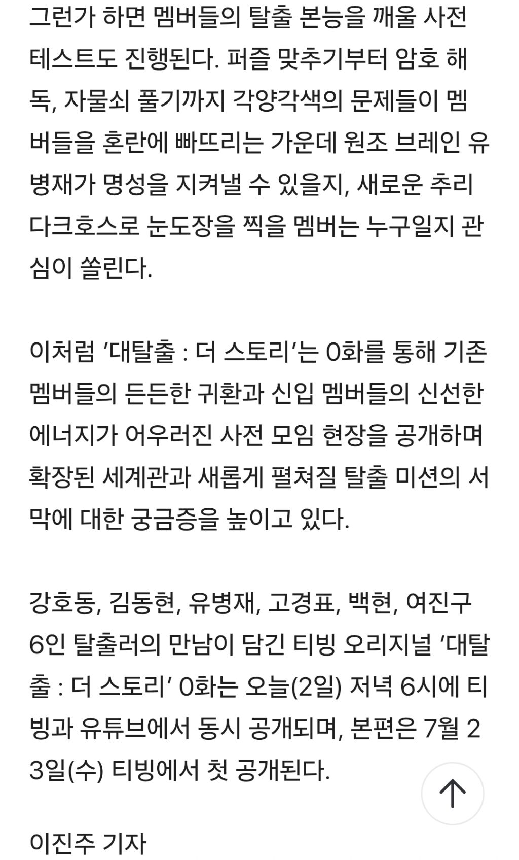 [bnt뉴스]‘대탈출 : 더 스토리’ 오늘(2일) 0화 공개 작성자호동이의힘[혜진]|작성시간25.07.03|조회수84 목록 댓글 1 글자크기 작게가 글자크기 크게가 다음검색 현재 게시글 추가 기능 열기 북마크 공유하기 신고 센터로 신고 댓글 댓글 1 댓글쓰기 답글쓰기 댓글 리스트 작성자호동이의힘[혜진] 작성자 본인 여부 작성자 | 작성시간 25.07.03 대탈출 퐈야~!!!! 느므느므 기대된다욤♡ 댓글 전체보기