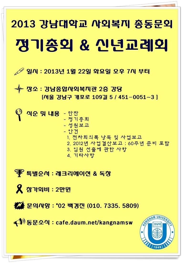 강남대 사회복지 총동문회에서는 오는 2013년 1월 22일(화) 저녁 7시 강남사회종합복지관에서 2013년도 정기총회 및 신년교례회를 개최하오니 바쁘시더라도 꼭 참석하여 주셔서 자리를 빛내주시기 바랍니다.