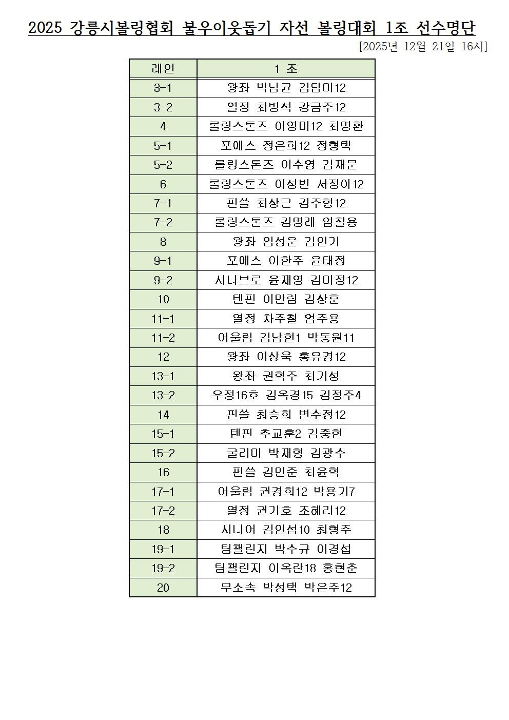 1조 접수(12/21 16시 수정) 작성자구르는 돌|작성시간25.12.09|조회수762 목록 댓글 86 글자크기 작게가 글자크기 크게가 다음검색 현재 게시글 추가 기능 열기 북마크 공유하기 신고 센터로 신고 댓글 댓글 86 댓글쓰기 답글쓰기 댓글 리스트 작성자김인섭 | 작성시간 25.12.16 강릉시니어 1팀 작성자구르는 돌 작성자 본인 여부 작성자 | 작성시간 25.12.16 팀챌린지볼링클럽 박수규 이경섭 답댓글 작성자구르는 돌 작성자 본인 여부 작성자 | 작성시간 25.12.16 추가접수 작성자팀챌린지 박윤미 | 작성시간 25.12.20 팀챌린지이옥란 홍현춘 접수합니다 작성자pstsis | 작성시간 25.12.21 박성택 박은주 접수합니다 댓글 전체보기