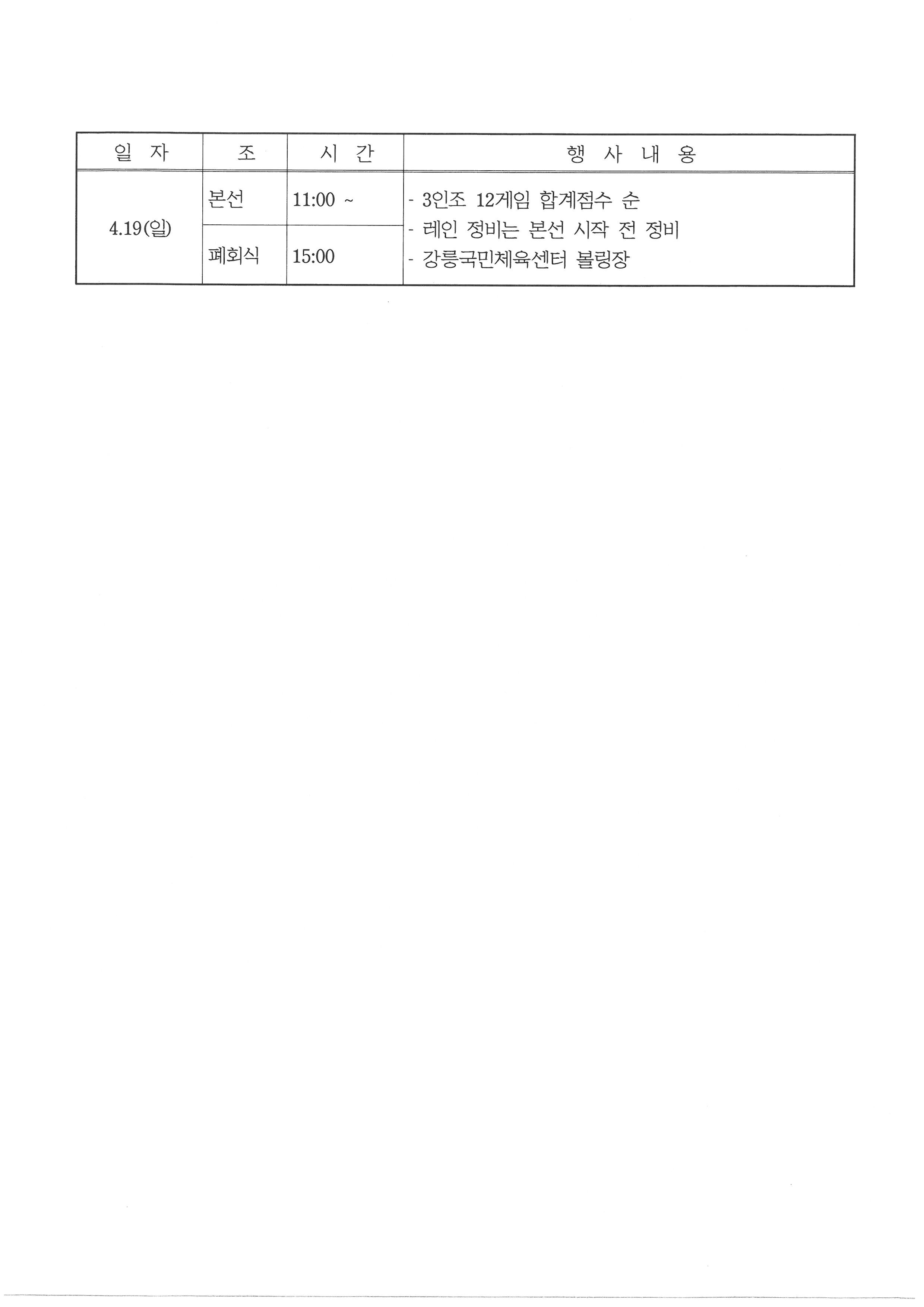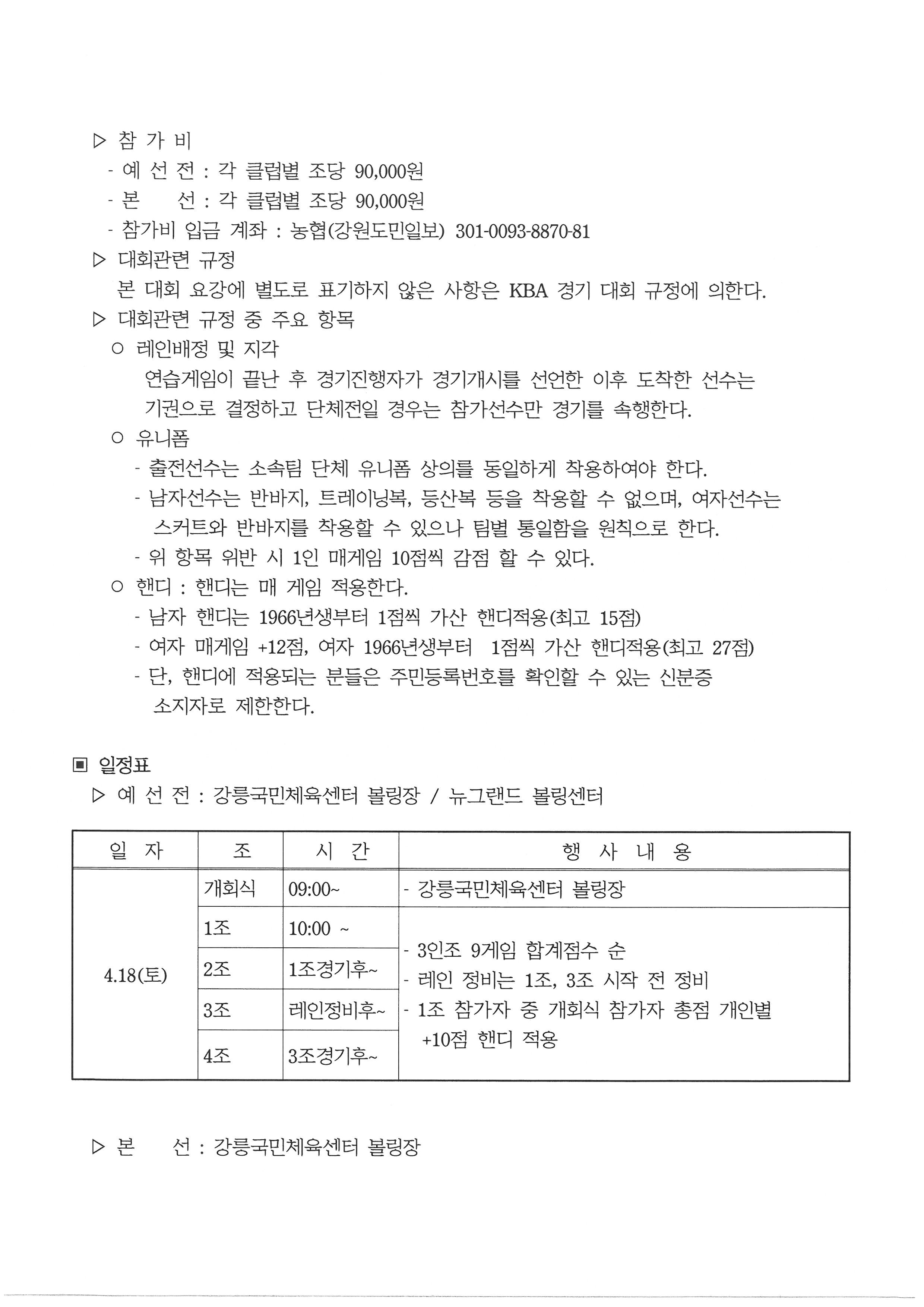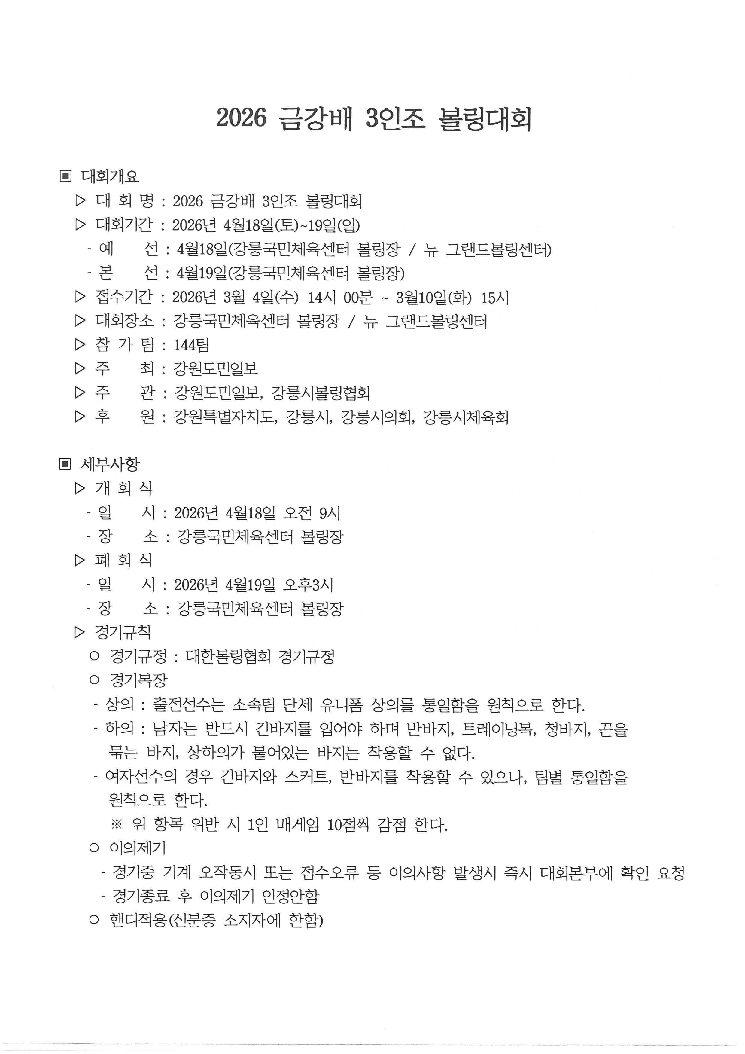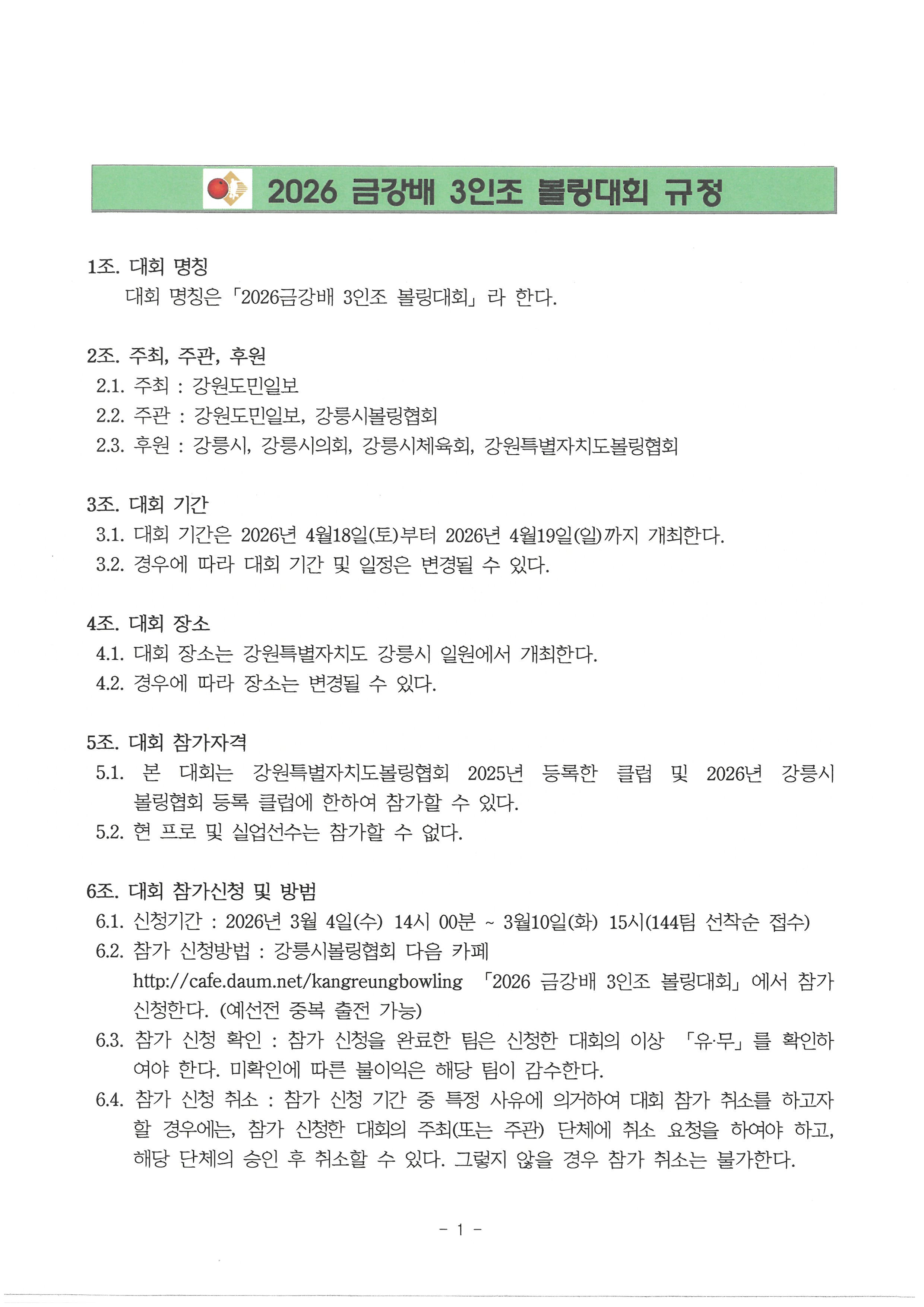 2026금강배 3인조 볼링대회 참가팀 모집 작성자동해바다(김수철)|작성시간26.02.05|조회수477 목록 댓글 1 글자크기 작게가 글자크기 크게가 다음검색 현재 게시글 추가 기능 열기 북마크 공유하기 신고 센터로 신고 댓글 댓글 1 댓글쓰기 답글쓰기 댓글 리스트 작성자동해바다(김수철) 작성자 본인 여부 작성자 | 작성시간 26.02.09 일부 수정사항 있습니다.(26.02.09) 댓글 전체보기