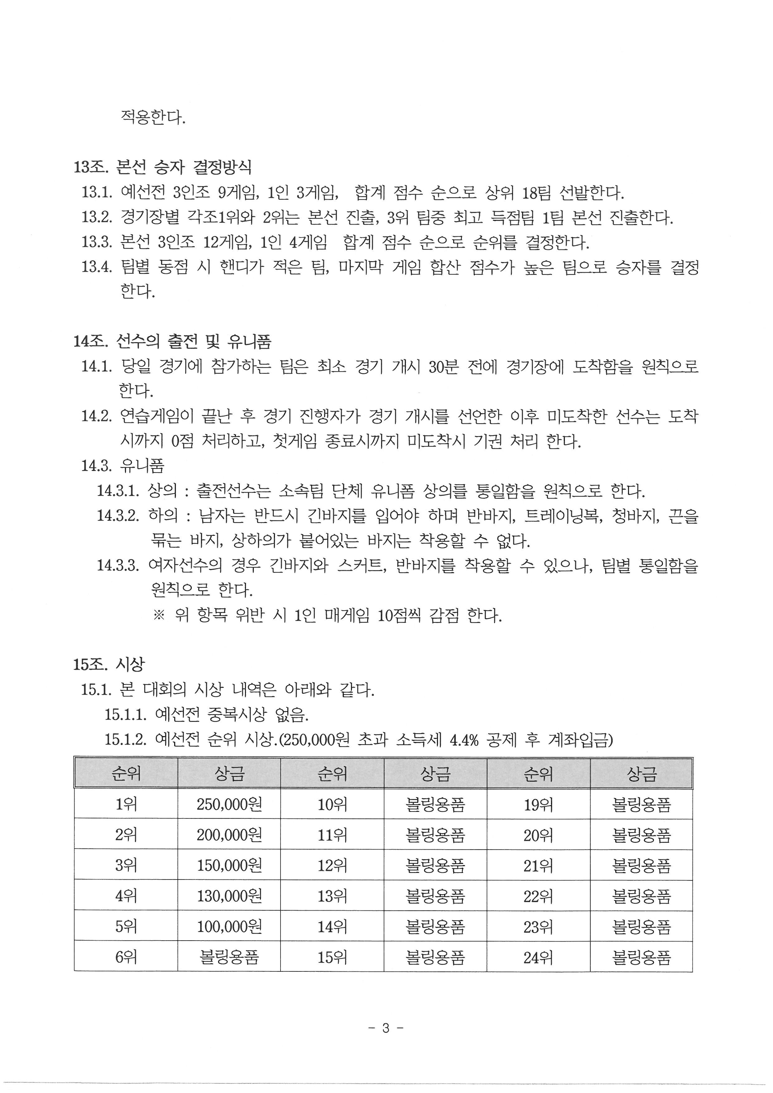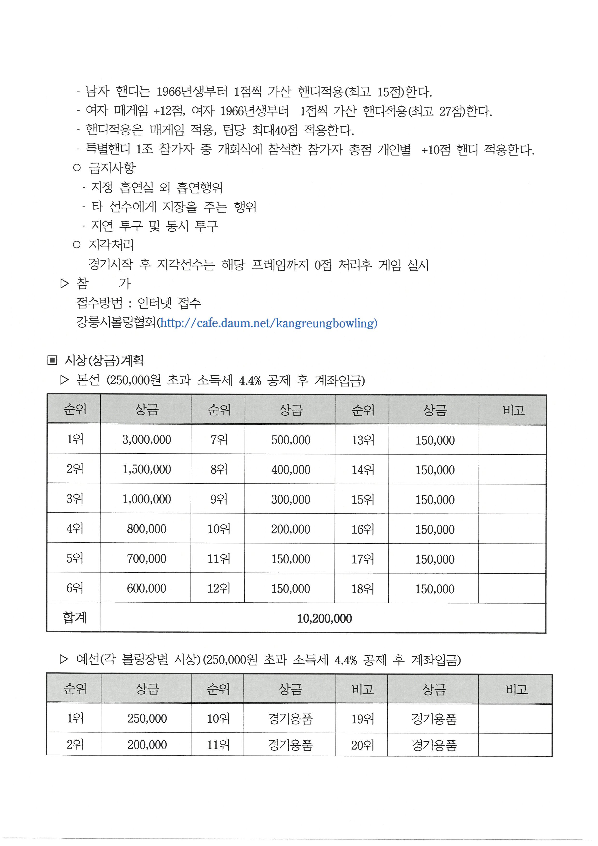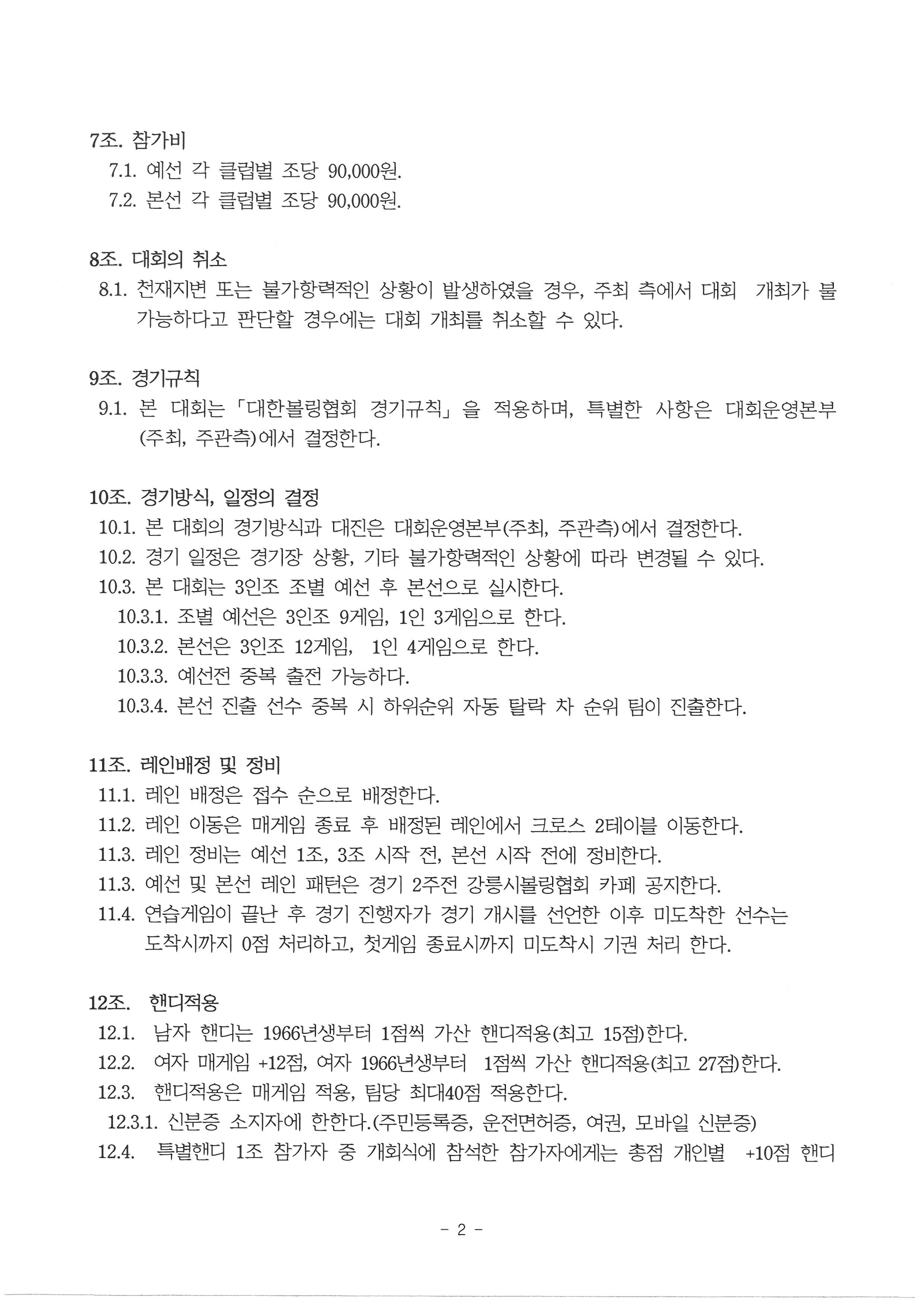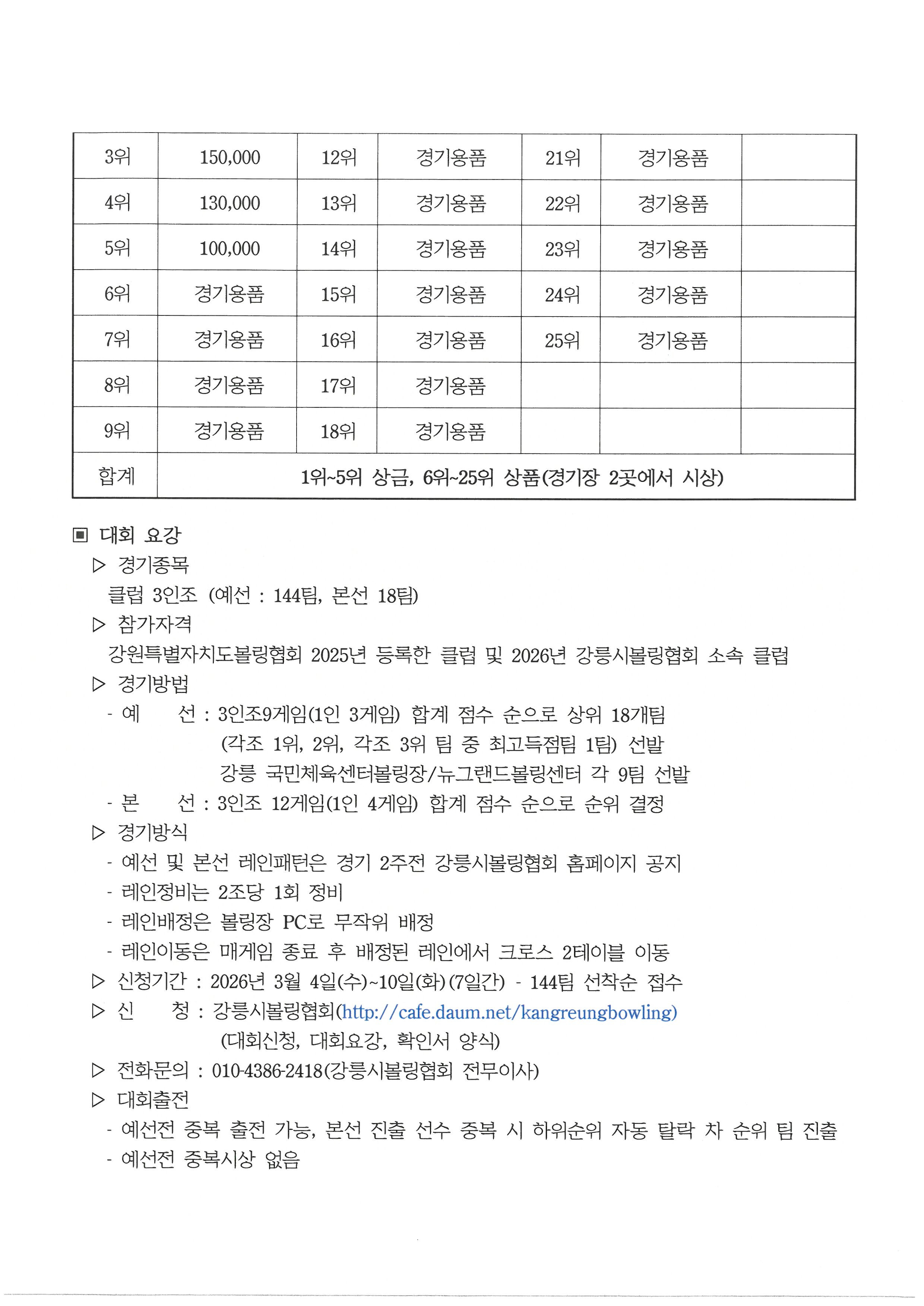 2026금강배 3인조 볼링대회 참가팀 모집 작성자동해바다(김수철)|작성시간26.02.05|조회수477 목록 댓글 1 글자크기 작게가 글자크기 크게가 다음검색 현재 게시글 추가 기능 열기 북마크 공유하기 신고 센터로 신고 댓글 댓글 1 댓글쓰기 답글쓰기 댓글 리스트 작성자동해바다(김수철) 작성자 본인 여부 작성자 | 작성시간 26.02.09 일부 수정사항 있습니다.(26.02.09) 댓글 전체보기
