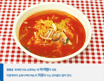 그런데 ‘짬뽕’ 역시 일본어이고 순화 대상 단어에 들어가 있다는 사실이 놀라운데요. 일본어 ‘ちゃんぽん(쨘뽄)’에서 온 말로 ‘국어순화용어집’에서는 ‘초마면’이라고 순화하여 쓸 것을 권하고 있습니다.