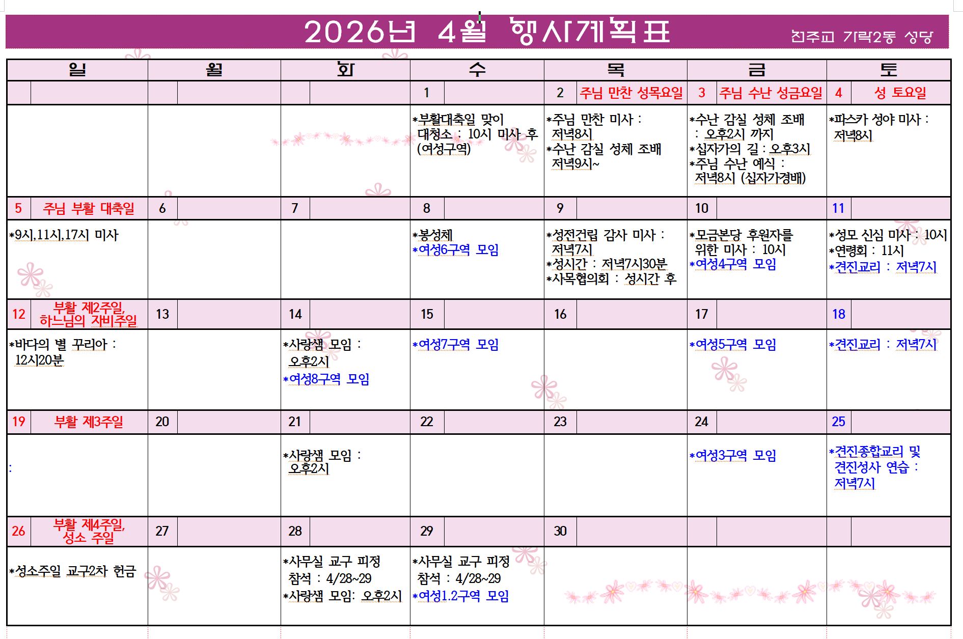 2026년 4월 행사계획표 작성자ALOHA|작성시간26.03.25|조회수513 목록 댓글 0 글자크기 작게가 글자크기 크게가 다음검색 현재 게시글 추가 기능 열기 북마크 공유하기 신고 센터로 신고 댓글 댓글 0 댓글쓰기 답글쓰기 댓글 리스트