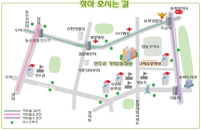 ☞ 네비게이션 : 천주교 가락2동성당 -- (신주소)서울 송파구 가락동 중대로20길 20-1 (구주소)서울시 송파구 가락2동 154-10 ☎ 2043-0085 ☞ 지 하 철 : 3호선 경찰병원역 3번 출구 5호선 오금역 4번 출구, 개롱역 4번 출구 ☞ 버 스 : 극동아파트 앞 3217, 3418. 3219, 3415, 3417, 362, 8362, 성남5