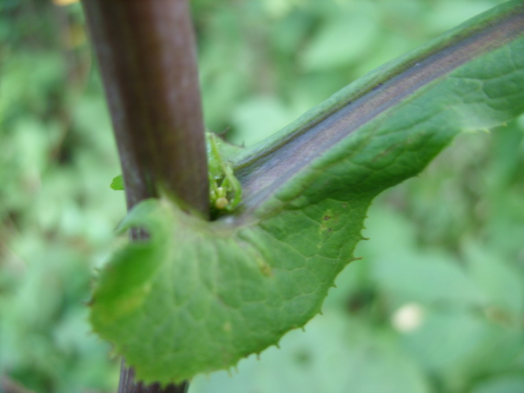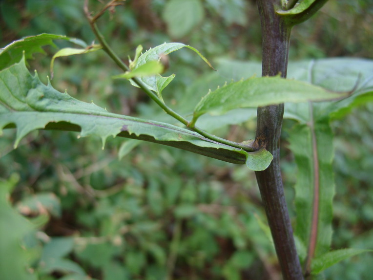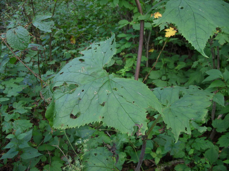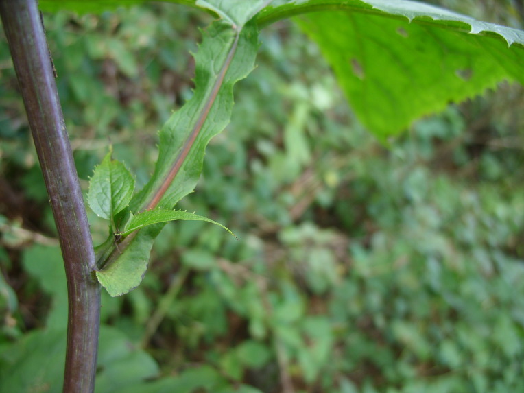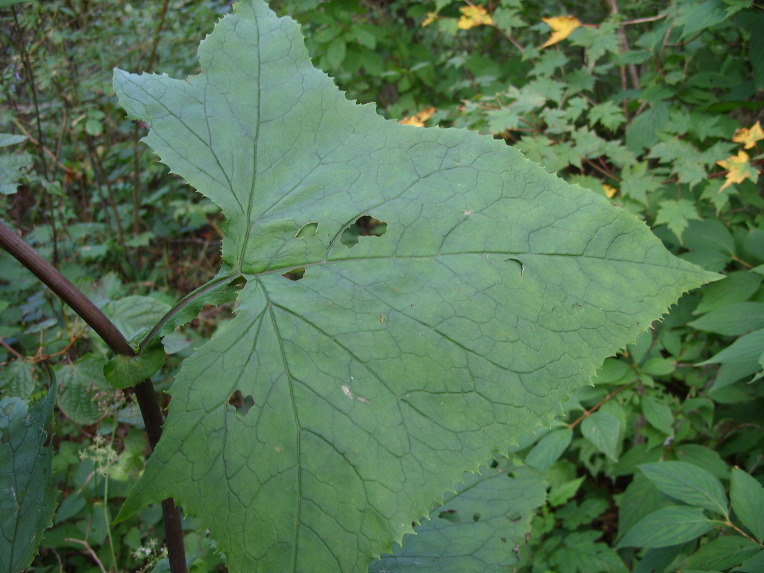 잎은 어긋나고 삼각형이며 끝이 뾰족하고 밑 부분이 약간 심장형 이며 가장자리에 톱니가 있다. 줄기 중간 부분에 달린 잎은 길이가 15cm, 폭이 25cm이고, 엽병은 날개가 있으며 밑 부분의 날개가 넓어 줄기를 감싼다.