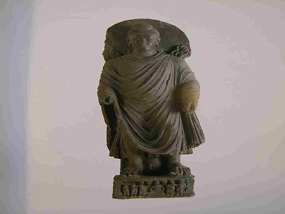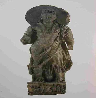 불입상 간다라의 통례적인 불입상의 형식에 따라 머리 뒤에는 광채를 상징하는 원광이 있고, 몸에는 통견의 법의를 걸치고 있다. 우슈니샤가 높이 솟아 있고 그 위에 머리카락이 얕은 물결 모양의 무늬로 새겨져 있다. 눈은 가늘게 뜨고 있고, 입술의 윗쪽 좌우에 약간 도드라진 부분이 있어서 그 부분에 수염을 그려 넣었을 것으로 보인다. 이러한 얼굴인상은 간다라 불교조각의 전성기에 탁트이바히 사원지 등을 중심으로 발달했던 전형적인 불상의 모습을 보여준다.
