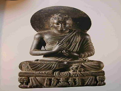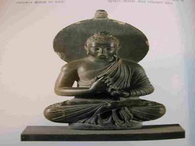 불좌상 편단우견의 복장과 설법인의 자세. 커다란 머리 ,작달막한 체구, 둥글둥글한 형태 등은 양식적으로 앞의 상들과 전혀 다른 모습을 보여준다. 이러한 형태는 간다라 후기 조각에서 현저하게 드러나는 특징이다.