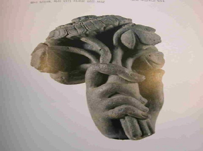 오른손에 커다란 연꽃 송이가 들려 있다. 크기로 보아서 등신대 크기의 상의 일부분이었을 것으로 여겨진다. 이 만한 크기의 대형상으로서 이러한 연화를 들었을만한 존상은 보살상뿐이라고 생각된다. 보살상들 중에는 이와 같은 연꽃을 드는 예들이 있는데, 특히 반가 자세로 앉은 보살상들 가운데 그러한 예를 많이 찾아볼 수 있다. 따라서 이 손도 그러한 보살상의 부분이었을 것으로 보인다. 간다라의 반가보살상들 가운데 이와 같이 연꽃을 든 상들은 연꽃을 들고 있다는 사실 때문에 흔히 관음보살로 추정되고 있다.