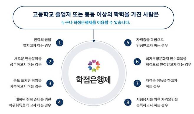 | ◈ (학점은행제) 학교 안팎의 다양한 학습과 자격을 학점으로 인정, 전문대학 또는 대학과 동등한 학위를 수여하는 개방형 평생학습제도(학사 118개, 전문학사 111개 전공) ◈ (독학학위제) 국가주관 시험을 통해 경력단절 여성, 재직자, 군인, 재소자 등 대학 진학이 어려운 성인 학습자에게 대안적 학사학위 취득 기회 제공(학사 11개 전공) |