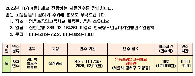 2025. 11/17(월)부터 새로 웰빙연수를 시작합니다. 작성자다이사트|작성시간25.11.13|조회수62 목록 댓글 0 글자크기 작게가 글자크기 크게가 2025. 11/17(월)부터 새로 웰빙연수를 시작합니다.많은 참여와 주위에 홍보도 부탁드립니다. 다음검색 현재 게시글 추가 기능 열기 북마크 공유하기 신고 센터로 신고 댓글 댓글 0 댓글쓰기 답글쓰기 댓글 리스트
