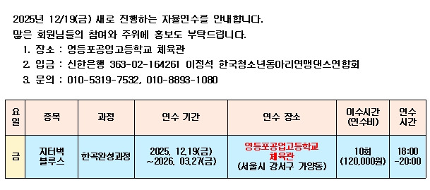 2025. 12/19(금)부터 새로 웰빙한곡완성반을 시작합니다. 작성자다이사트|작성시간25.12.11|조회수83 목록 댓글 0 글자크기 작게가 글자크기 크게가 2025. 11/17(월)부터 새로 웰빙연수를 시작합니다.많은 참여와 주위에 홍보도 부탁드립니다. 다음검색 현재 게시글 추가 기능 열기 북마크 공유하기 신고 센터로 신고 댓글 댓글 0 댓글쓰기 답글쓰기 댓글 리스트
