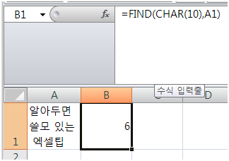 ALT-ENTER를 눌렀을 때 입력되는 문자는 눈에 보이지는 않지만 아스키코드가 10번이라고 했습니다. A1셀에서 아스키코드10번에 해당하는 문자를 찾는 수식을 입력하니 답이 6이 나왔습니다. "알아두면"의 4글자와 공백 하나 뒤에 ALT-ENTER가 들어갔기 때문입니다.