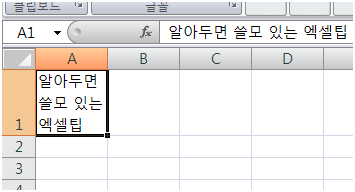 A1셀의 너비를 변경하지 않고 A1셀의 너비에 맞게 문자열이 자동으로 세 줄로 만들어졌습니다.