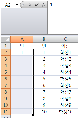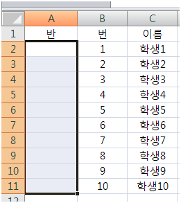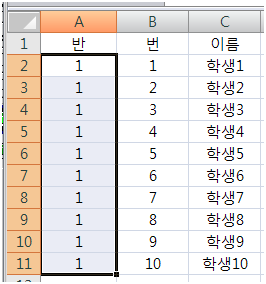 각 반의 명렬표를 받아오면, 반은 표시되지 않고 번호,이름만 표시되어있는 경우가 있습니다. 이때 모든 학생들이 똑같이 1반이므로, A열에는 1이라는 숫자를 모두 써줘야합니다.