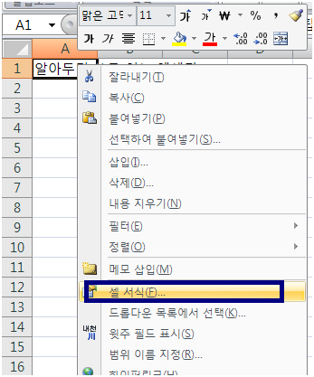 A1셀을 오른쪽 클릭하여 "셀서식"에 들어갑니다.
