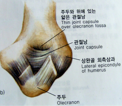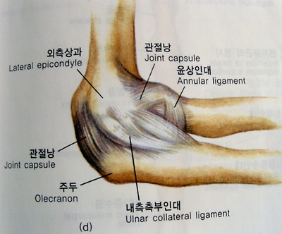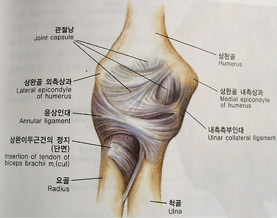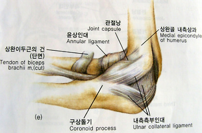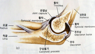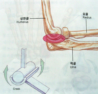 [접번관절- 상완골 근위단과 척골 근위단 사이관절. 운동가능 방향을 나타내고 있음.]
